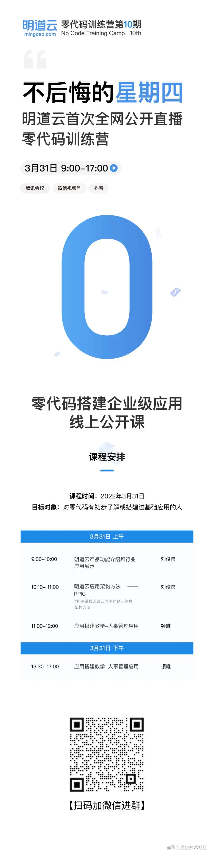 不后悔的星期四,明道云首次全网公开直播零代码训练营 明道云 2022-03-30 130 阅读1分钟 由于全国各地疫情形势不明朗,明道云决定将第十期零代码训练营以线上直播形式举行,并向所有人免费开放!训练营为期一天,腾讯会议、微信直播号、抖音平台同步进行。目前已有超过160位用户报名参与,我们期待您的加入!