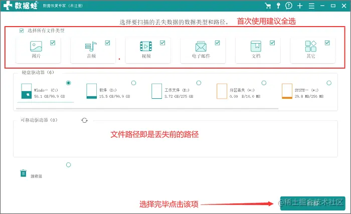 第1步:启动软件数据蛙数据恢复专家后,选择丢失的文件类型还有文件丢失前的存储位置,以实际情况选择完成后即可开始“扫描”;