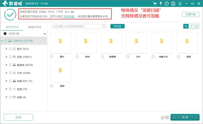 备注:第一次扫描为快速扫描模式,所以扫描范围会在离删除时间最近的这一片进行检测,难免有些比较久远的会触及不到,所以如果找不到或找不齐的话不要慌,我们点击“深度扫描”即可!