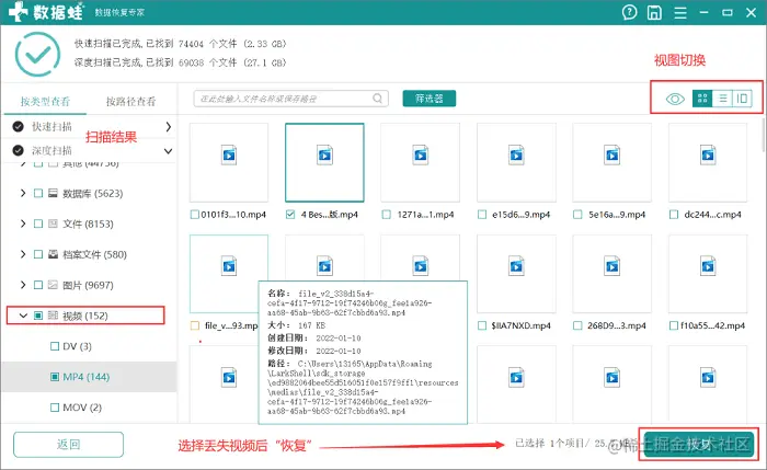 第2步:最后我们只要在扫描出来的结果中找到自己丢失的那个文件即可,图以视频为例,我们可以在视图窗口之间切换来看一下大小等信息,选择好后点击“恢复”!为了避免路径冲突,建议将恢复路径设为丢失位置外的位置!