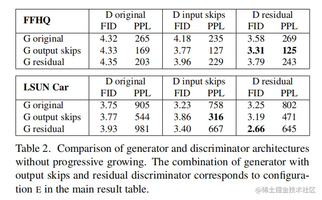 使用Progressive growth的原因是高分辨率图像生成需要的网络比较大比较深,当网络过深的时候不容易训练,但是skip connection可以解决网络深度的训练问题。因此出现了下面的三种使用了skip connection的结果,并且StyleGAN2对三种结构的效果进行了实验评估: