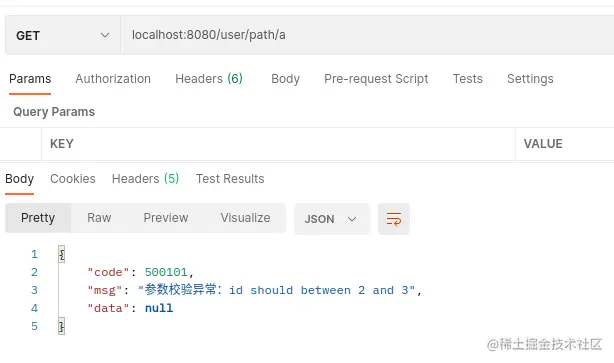 当路径上的id="a"的长度小于2时服务端校验后给前端返回正确的校验结果:
