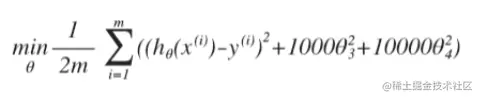 我们决定要减小ø3和ø4的大小,我们需要做的就是修改代价函数,在其中ø3和ø4的身上,设置一些**惩罚 (Punishment) **。这样做的话,我们在尝试最小化代价时,也需要将这个惩罚代入考虑中,并最终导致选择小一些的ø3和ø4 。 修改之后的代价函数如下: