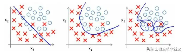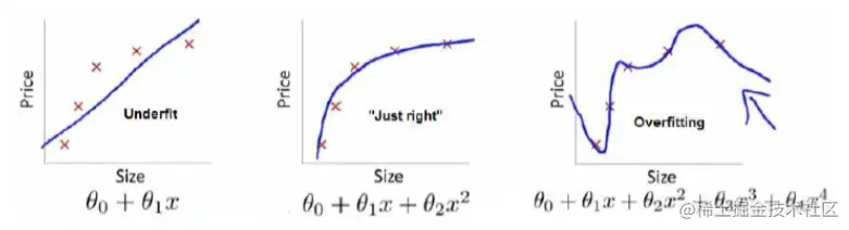 从左至右来看,第一个模型是一个线性模型,拟合度很低,也称作**低度拟合 (Underfitting) **,不能很好地适应我们的训练集;第三个模型,是一个四次方的模型,属于过度拟合,虽然能够很好地适应我们的训练集数据,但是在新输入变量进行预测的时候,可能效果会很差;而第二个模型,似乎是最合适的模型。