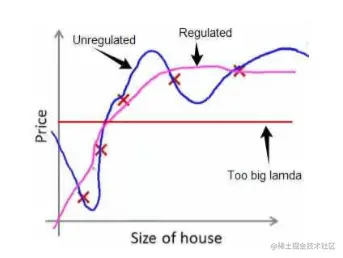 如果选择的归一化参数λ过大,就会把所有参数都最小化了,这样导致模型hø(x)=ø0也就是上图中的红色直线的情况,数据就属于低度拟合。