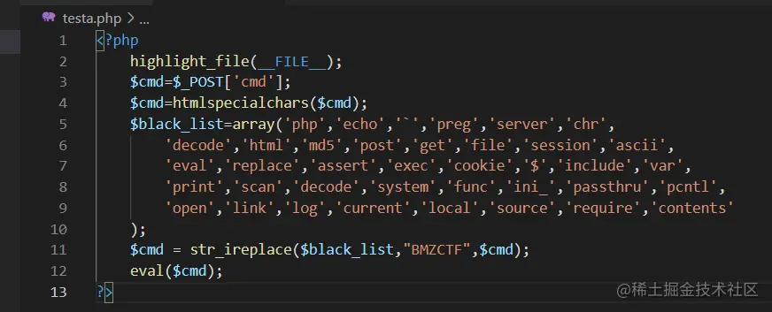 分析: 我们通过POST方式,向cmd提交内容,然后cmd经过htmlsmecialchars()过滤,再使用str_ireplace()经过黑名单black_list再过滤一次,最后eval()来执行cmd参数的内容;
