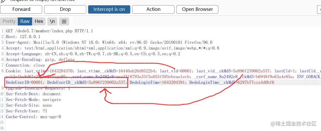然后用00001用户登陆后,刷新进行抓包,用之前我们访问00001主界面抓取到的cookie进行修改再发包过去: