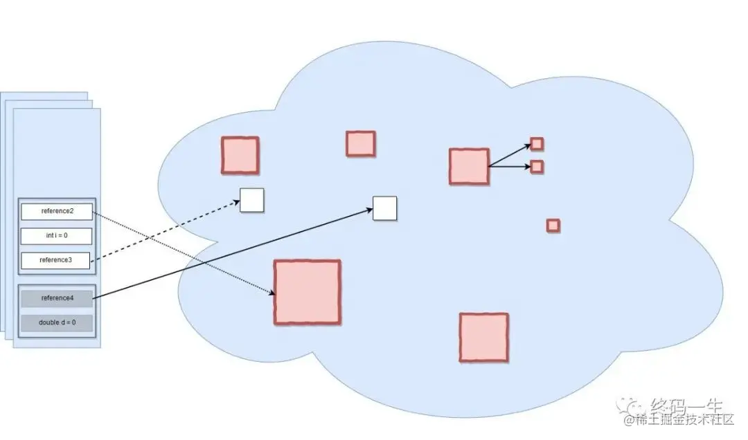 例如,所有红色的对象都有资格被垃圾收集器收集。您可能会注意到堆上有一个对象,它对也在堆上的其他对象具有强引用(例如,可能是一个引用其项目的列表,或者一个具有两个引用类型字段的对象)。但是,由于来自堆栈的引用丢失了,它不能再被访问,所以它也是垃圾。