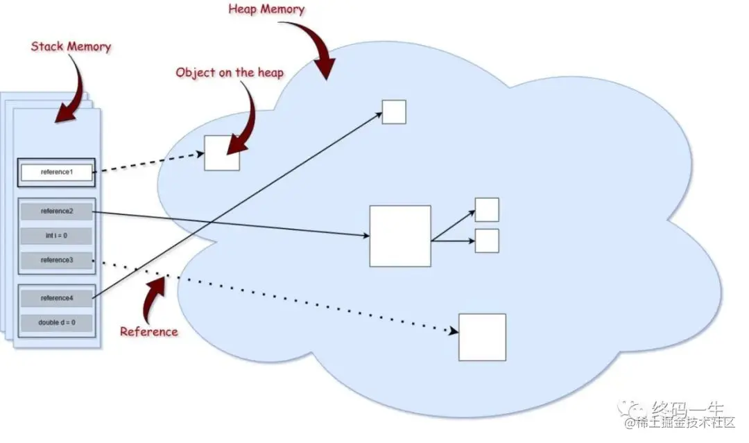通常,内存分为两大部分:栈区和堆区(这里不讨论方法区)。 请记住,这张图片中内存类型的大小与现实中的内存大小不成比例。与栈相比,堆是一个巨大的内存量。