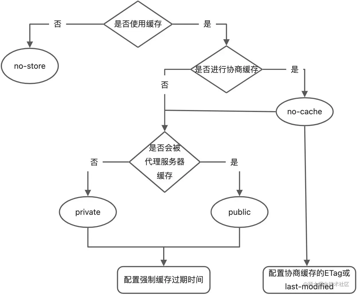 - 如果是强制缓存,接下来考虑是否允许中间代理服务器缓存该资源,参考之前在强制缓存中介绍的内容,可通过为 cache-control 字段添加 private 或 public 来进行控制。,然后设置强制缓存的过期时间