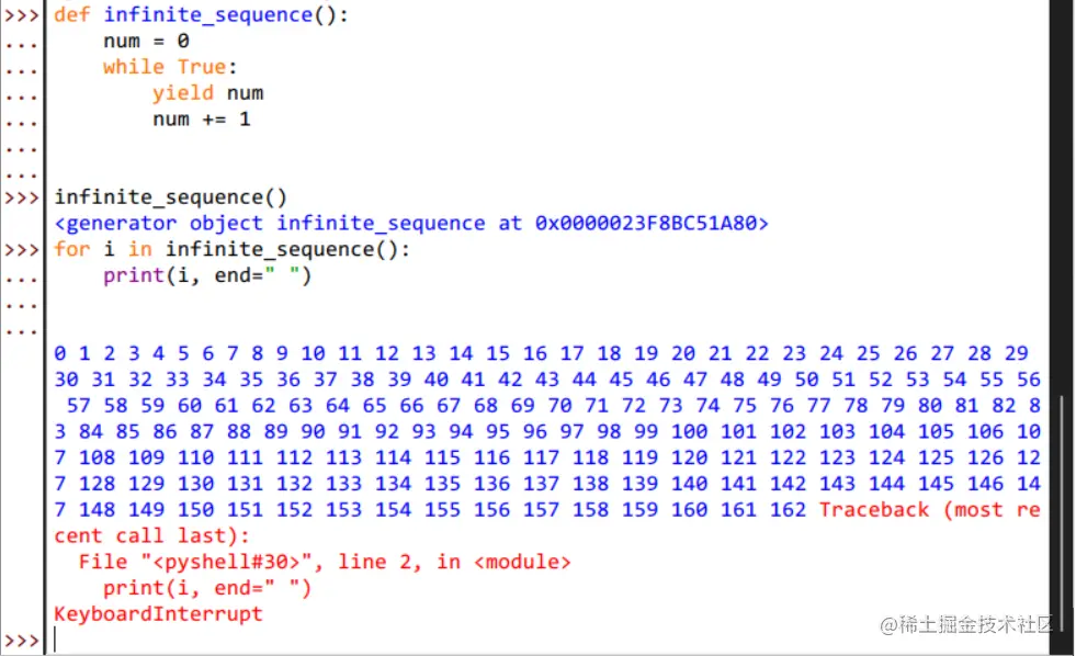 生成器的另一个常见场景是无限序列生成。在 Python 中,当您使用有限序列时,您可以简单地调用 range() 并在列表中对其进行计数,例如: