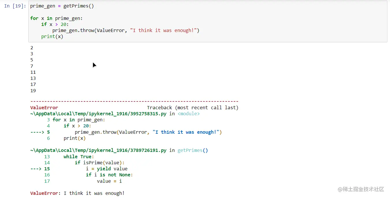 throw()允许您使用生成器抛出异常。例如,这对于以某个值结束迭代很有用。比如我们想得到小于 20 的素数就可以使用如下方法: