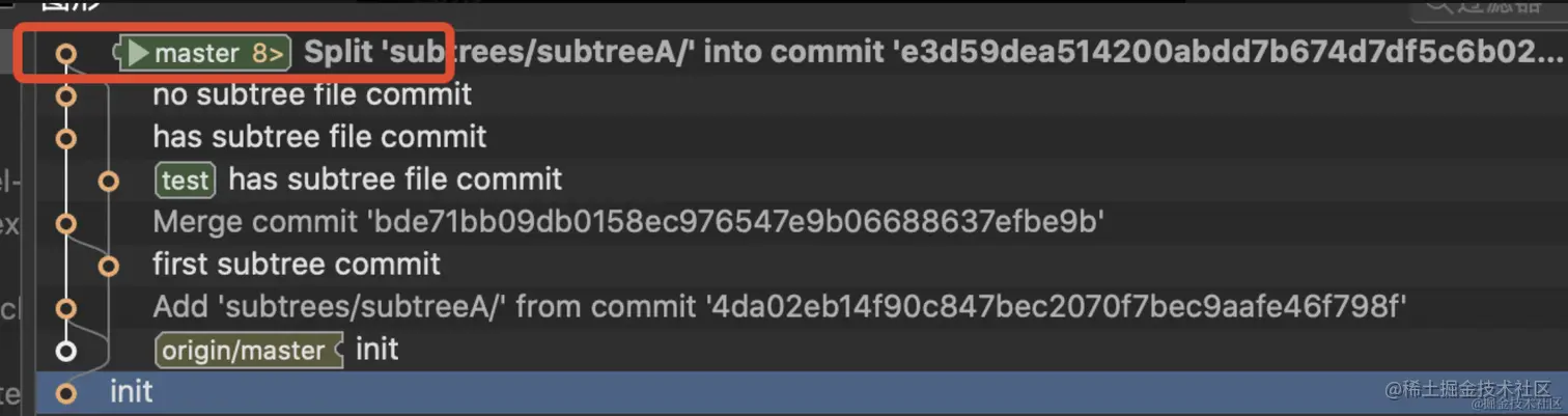 懂shell的同学应该都明白了,大概翻译一下就是commit message带有git-subtree-dir、git-subtree-mainline、git-subtree-spilt的提交就认为是split的提交,subtree add的提交记录和subtree split类似也符合这个规则,所以这个规则能同时找出split提交的add提交。