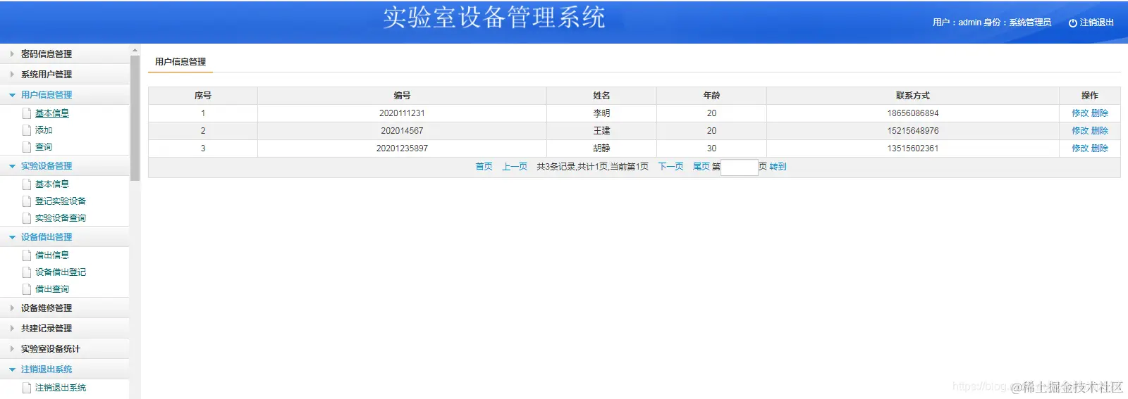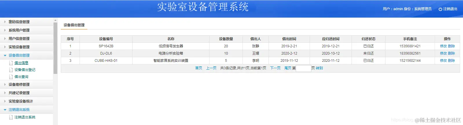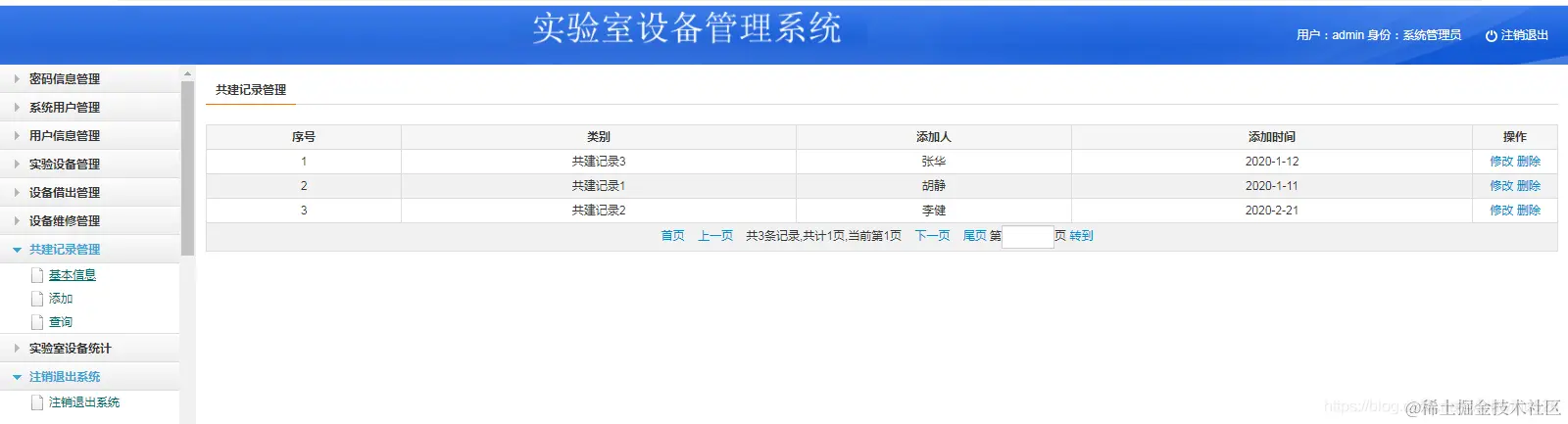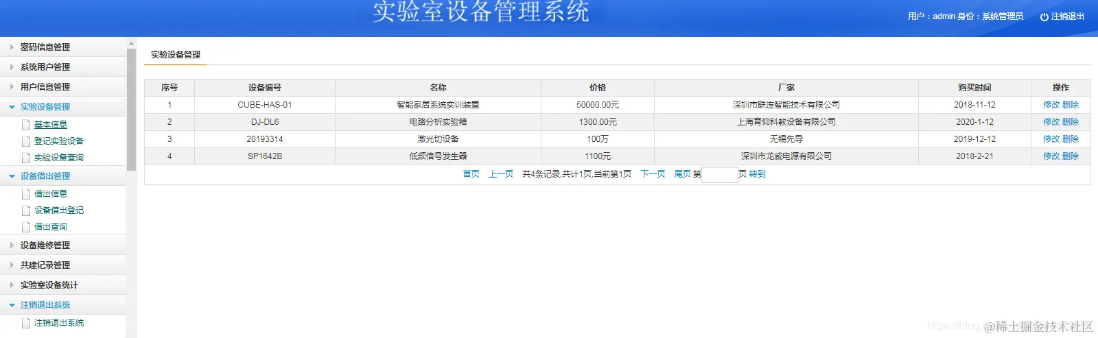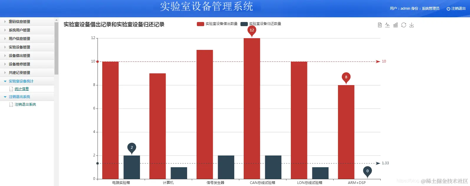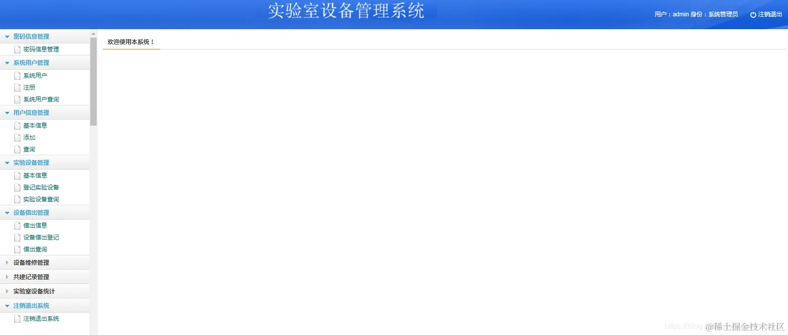 实验室设备管理系统主要包含两个用户角色,一个是超级管理员,可以进行系统的各种管理工作,一个是普通管理员,主要进入系统进行相应的信息查看工作。系统的主要功能包含有:登陆用户的信息修改,系统用户管理,使用设备的用户信息管理,实验设备管理,设备借出管理,设备维修管理,共建记录管理,实验室设备统计(图形报表的形式展示),注销退出,登陆系统。