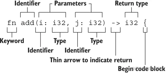 该函数如此简单,但是又是如此的五脏俱全,声明函数的关键字 fn ,函数名 add(),参数 i 和 j,参数类型和返回值类型都是 i32,总之一切那么的普通,但是又那么的自信,直到你看到了下面这张图:
