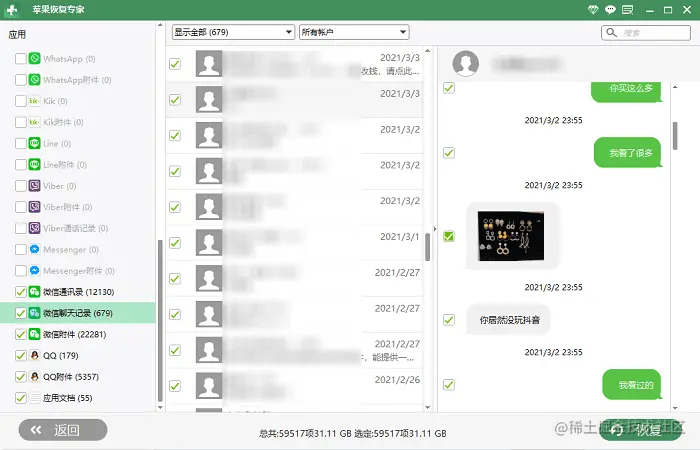 步骤二: 安装并扫描完后,在数据扫描过程没有出现任何异常的情况下,就会呈现下图的画面,点击左侧的“微信聊天记录”,找到想要恢复的微信图片,点击“恢复”即可。