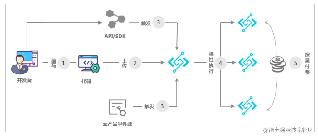 - 您无需采购与管理服务器等基础设施,只需编写并上传代码。