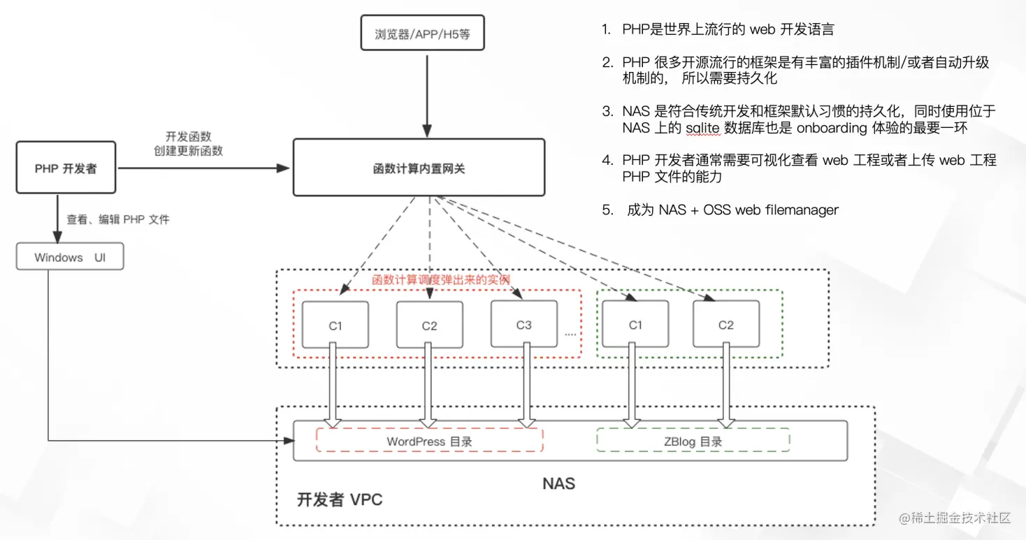 在文章 PHP 遇见 Serverless,帮你解决这些痛点!中, 我们十分细致地讨论了 PHP 应用在 Serverless 的最佳实践方式以及带来的巨大价值, 其中最重点的一个点是 FC 弹出的实例演化为存粹的执行环境, PHP web 工程存储到 NAS, 这个时候我们就可以使用 Kodbox + FC 实现 windows 体验般的 WEB UI 对 NAS 上的 PHP 工程就行管理, 包括上传、覆盖、删除、修改等。
