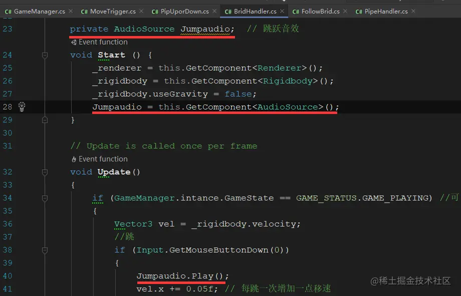 编辑GameManager脚本,添加下面三行代码到,下图位置: