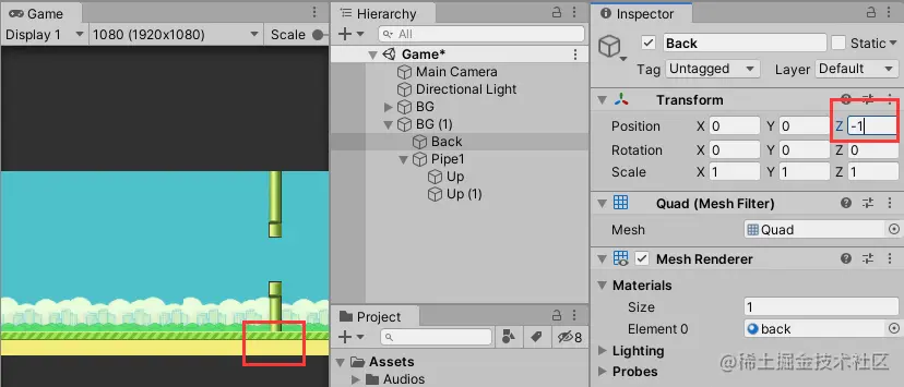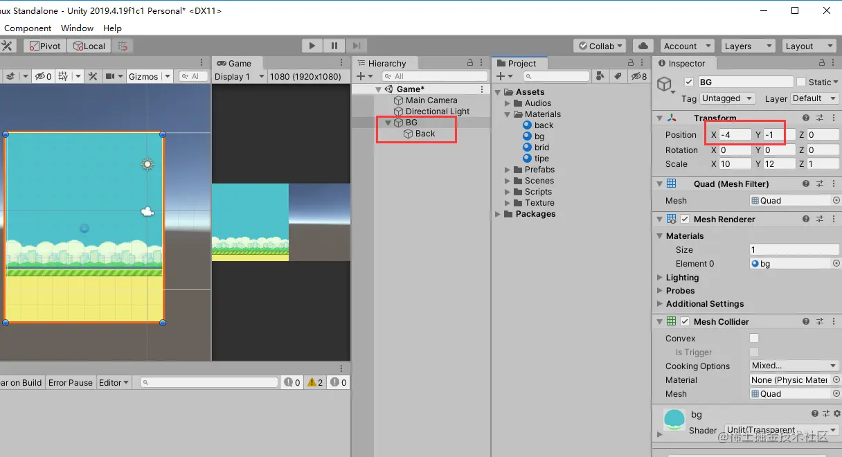 将背景“Quad” 重命名为BG,其子物体重命名为Back。然后修改BG的Position坐标为(-4,-1,0),使其在最左端出现,效果如下: