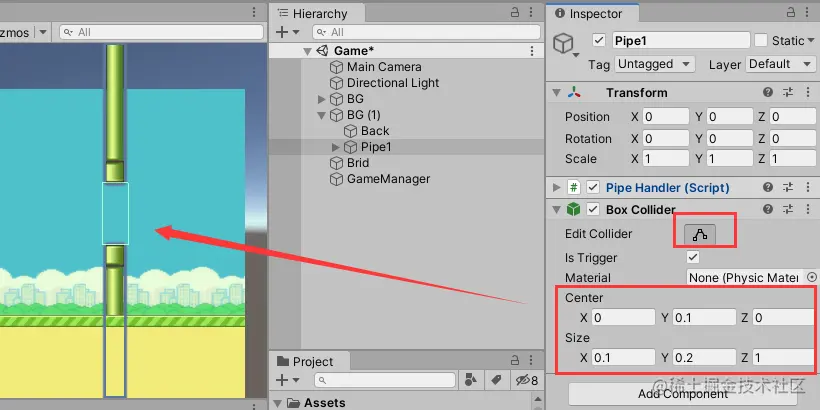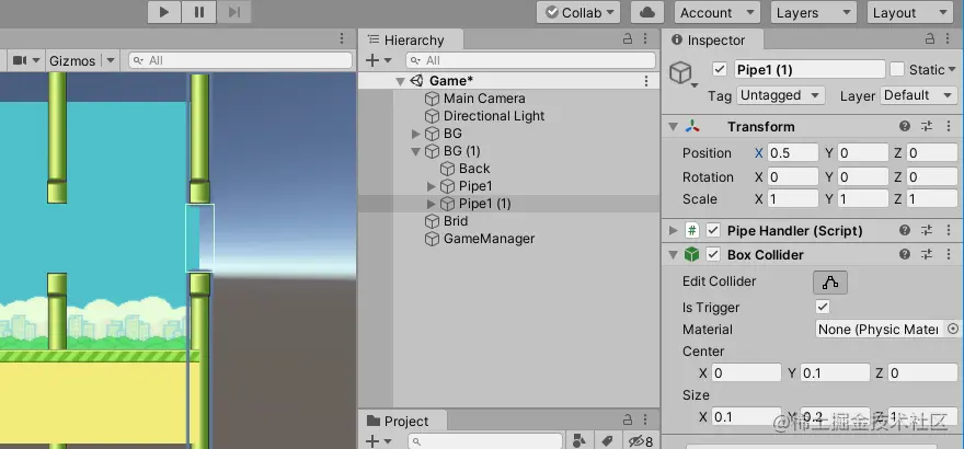 10.6 复制一份管子Pipe1,并将其位置调整为(0.5,0,0),这样一个地图两个管道了,这个间距比较符合游戏难度,效果如下图: