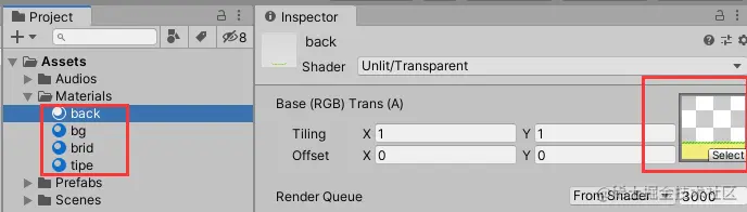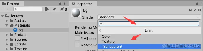 然后修改其名称为bg,修改其Shader为Unlit/Transparent: