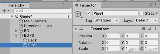 在新复制出来的BG (1) 下面创建一个空物体命名为Pipe1作为上下两个管子的父物体,设置坐标,旋转为(0,0,0),缩放为(1,1,1):