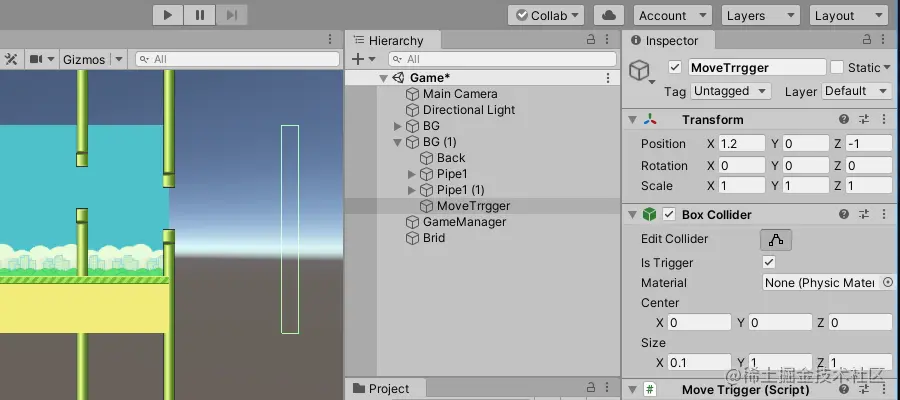 选择BG (1) 右键创建空物体重命名为“MoveTrrgger”,调整位置为(1.3,0,-1),并为其添加Box Collider 组件大小修改为(0.1,1,1),效果如下: