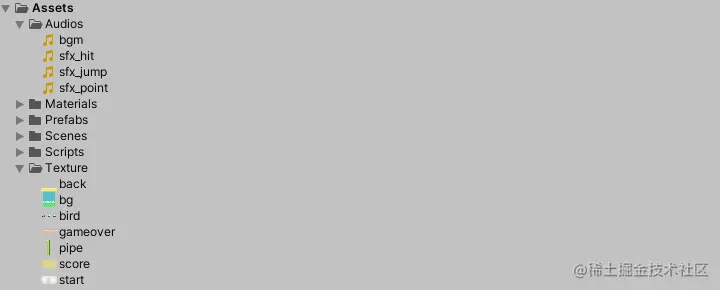 - Audios:音频资源, Materials:材质球, Prefabs:预制体, Scenees:游戏场景, Scripts:脚本资源, Texture:图片资源