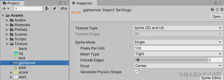 1.3 导入后将UI使用的图片资源格式修改为Sprite(2D and UI),按住Ctrl选中gameover,score和start三个图片进行个数修改,如下图: