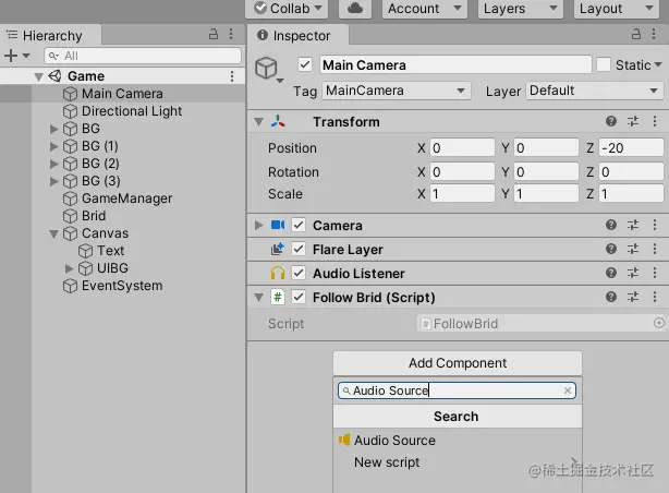 在Main Camera上添加"Audio Source"组件
