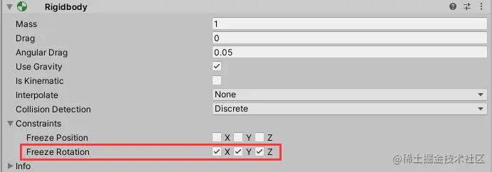并将其Constraint --> Freeze Rotation 的XZY全部勾选上,为避免其进行旋转: