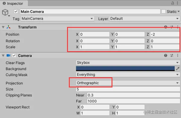 - 修改其坐标为(0,0,-2),旋转为(0,0,0),缩放为(1,1,1)
