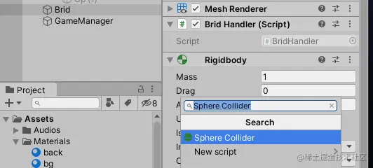 7.1 在主角Brid上面添加Rigidbody刚体组件: