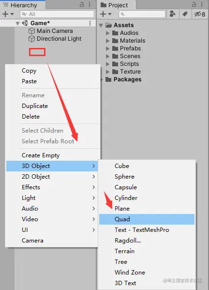 4.1 创建背景 在Hierarchy空白处右键 --> 选择3D Object --> 选择Quad 创建出来作为背景。