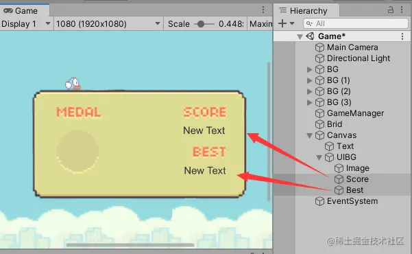 在"UIBG"下创建两个文本作为本局得分和最高分数显示分别命名为"Score"和"Best",调整位置文本如下: