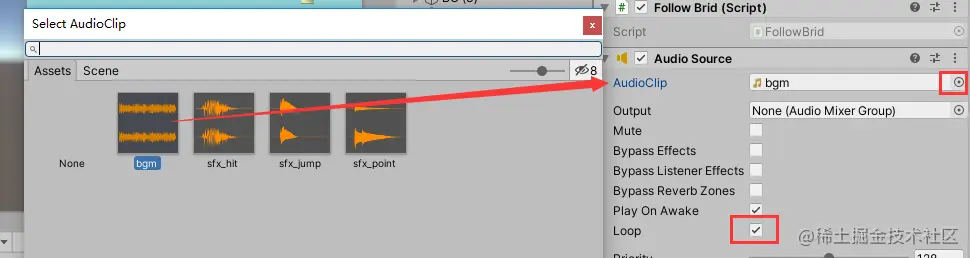 将bgm音效赋值给AudioClip属性,勾选Loop属性一遍循环播放: