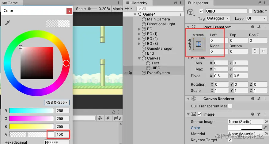 在Canvas下创建Image,作为游戏结束的背景板,使其铺满屏幕并调整其透明度为100,并将其重命名为"UIBG":
