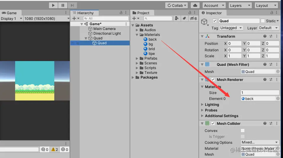同理选中Quad,移除“Mesh Collider”组件。
