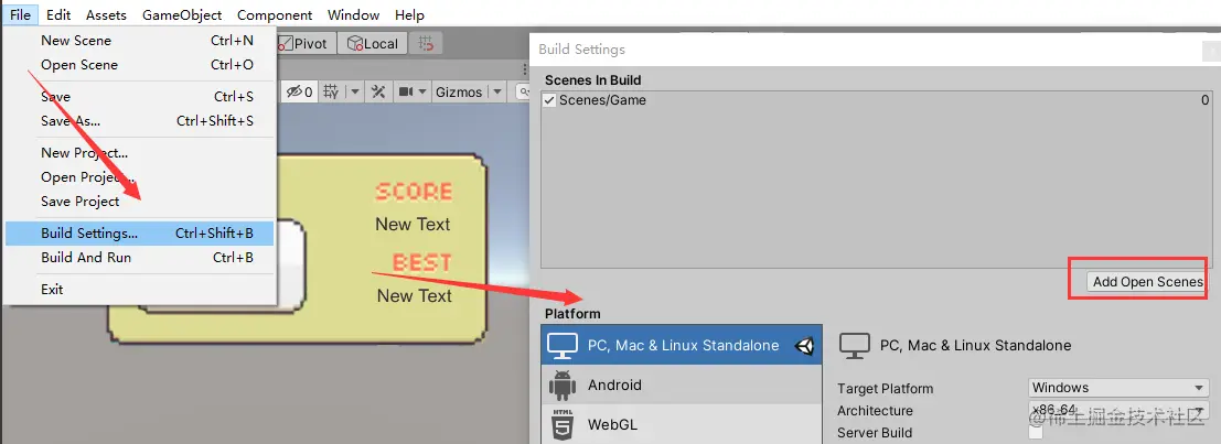 File --> Build Settings --> Add Open Scenes 添加场景,为打包和重玩逻辑做准备: