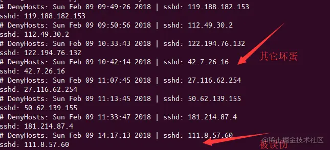 再看/etc/hosts.deny配置,客户的公网IP连同其它几个坏蛋IP正躺在黑名单里。