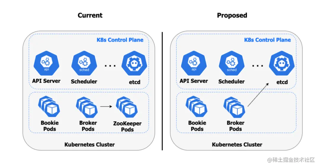 利用在 Kubernetes 集群内运行的现有 etcd 服务来作为元数据存储,用户可以完全不需要运行 ZooKeeper。这不仅减少了 Pulsar 集群的基础设施占用的资源,还减轻了运行和操作复杂的分布式系统所需的运营负担。