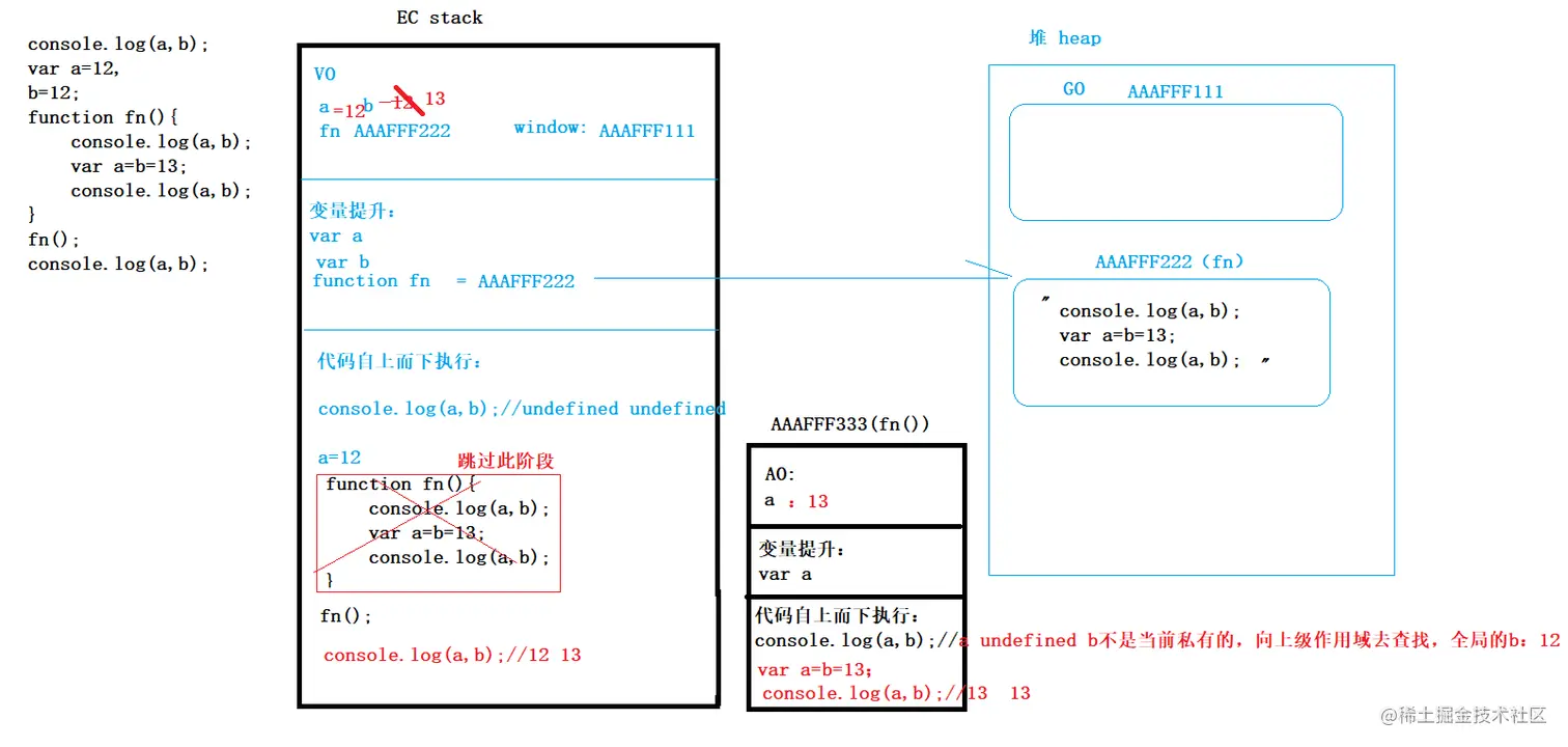 b=13; // 不是私有变量,向上查找,直到window都没有,给window添加一个属性 window.b=13;