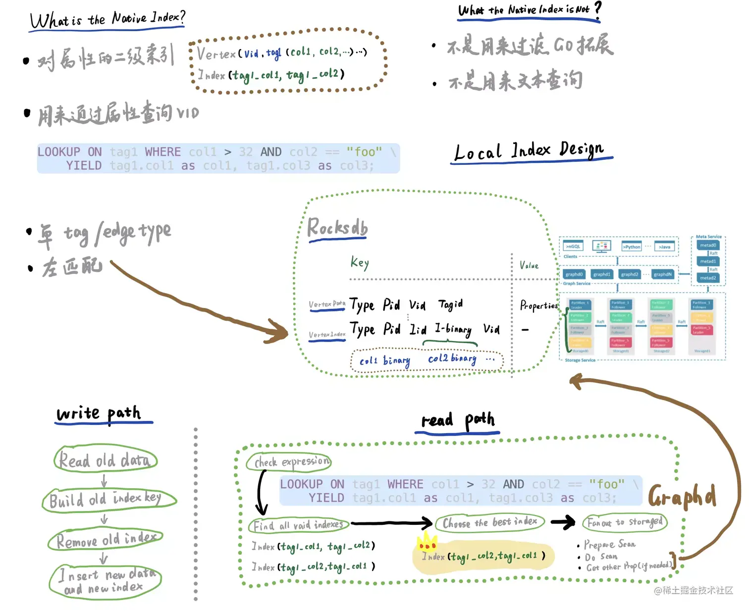 - Nebula Graph 索引是在本地(不是分开、中心化)和点数据被一起存储、分片的。