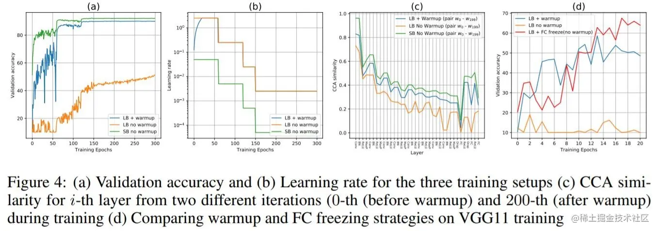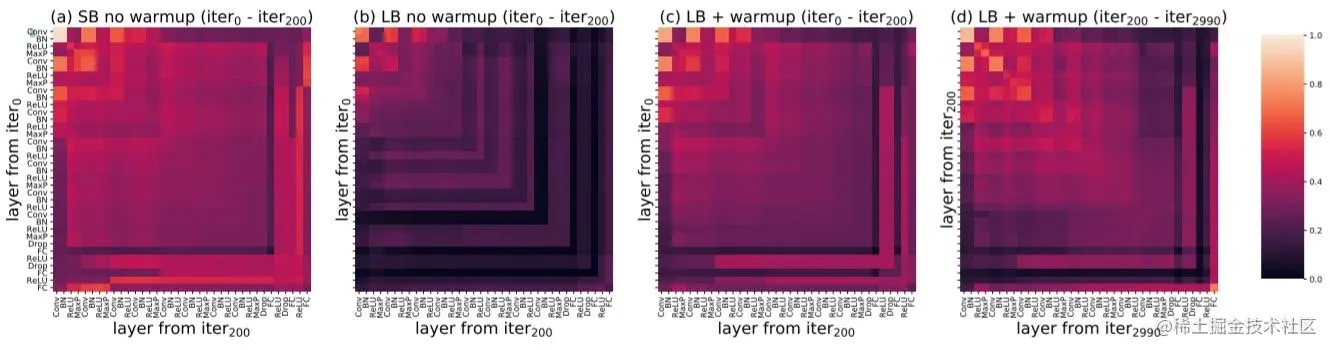 上图b,c表示有了warmup之后,模型最后几层的相似性增加,避免模型不稳定的改变。