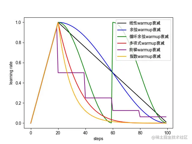 下列各种学习率衰减策略均采用warmup,为了图片反应的更加直观:起始学习率设置为1,warmup 步数为20,总步数为100。通常warmup步数可以设置为总步数的10%,参照BERT的经验策略。