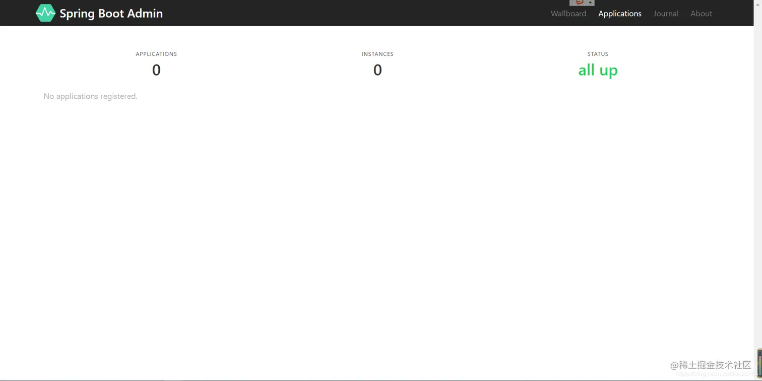这样在项目启动的时候就自动启动了springbootadmin,接下来运行项目,然后在浏览器上输入http://localhost:8080/#/applications就可以看到这个页面