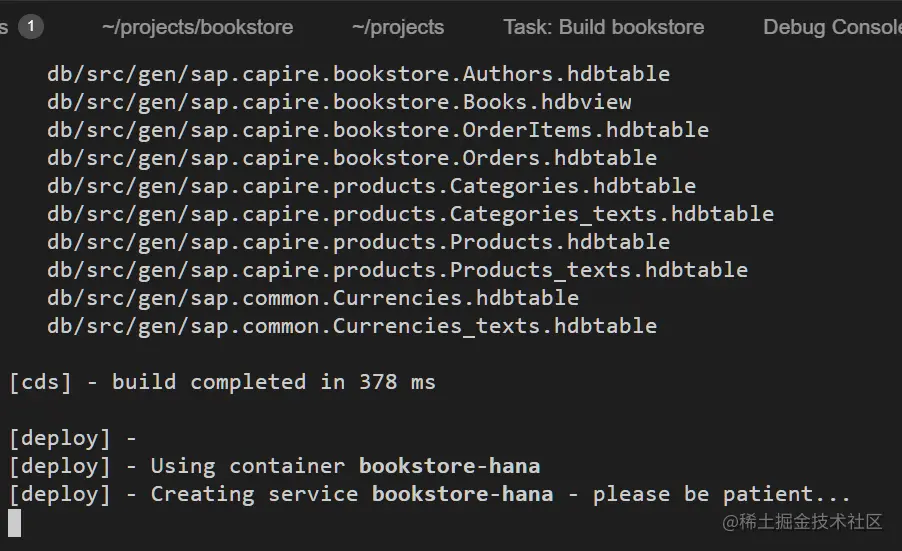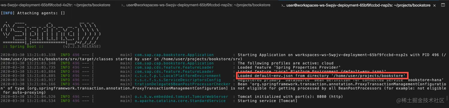 可以观察日志行 Loaded default-env.json from directory '/home/user/projects/bookstore' 和 Registered primary 'DataSource' bean definition for connected service 'bookstore-hana',这表明选择了 SAP HANA 配置被 Java 应用采纳了。