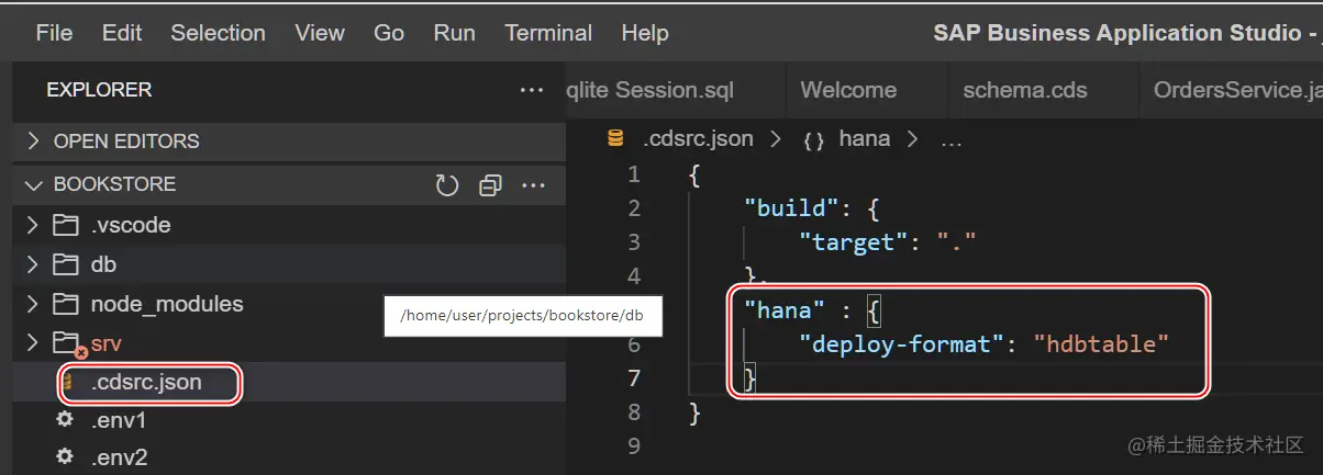 在项目文件夹根目录的 .cdsrc.json 文件里,添加如下的配置: